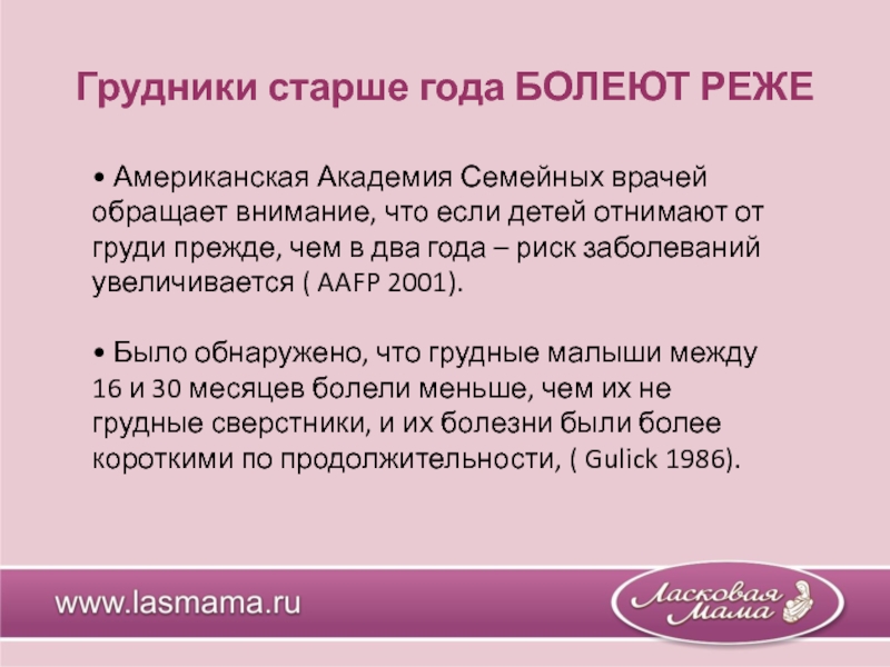 • Было обнаружено, что грудные малыши между 16 и 30 месяцев болели меньше, чем их не грудные сверстники, и их болезни были более короткими по продолжительности, ( Gulick 1986).