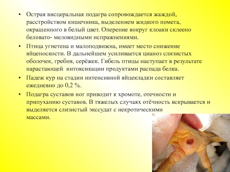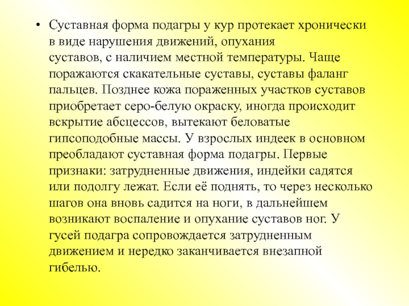 Слайд 15Суставная форма подагры у кур протекает хронически в виде нарушения