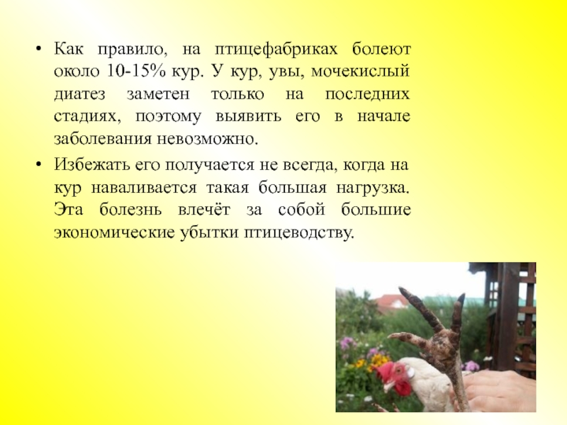 Слайд 11Как правило, на птицефабриках болеют около 10-15% кур. У кур,