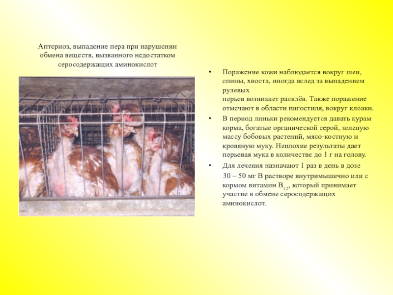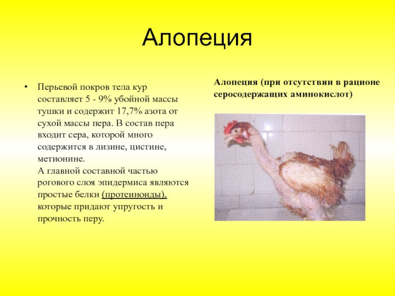 Слайд 9Аптериоз, выпадение пера при нарушении обмена веществ, вызванного недостатком серосодержащих