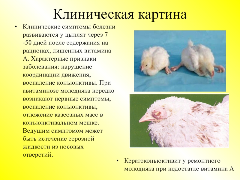 признаки заболевания: нарушение координации движения, воспаление конъюнктивы. При авитаминозе молодняка нередко возникают нервные симптомы, воспаление конъюнктивы, отложение казеозных масс в конъюнктивальном мешке. Ведущим симптомом может быть истечение серозной жидкости из носовых отверстий.
