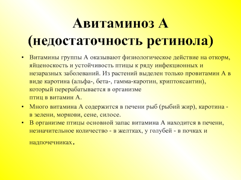 В организме птицы основной запас витамина А находится в печени, незначительное количество - в желтках, у голубей - в почках и надпочечниках.