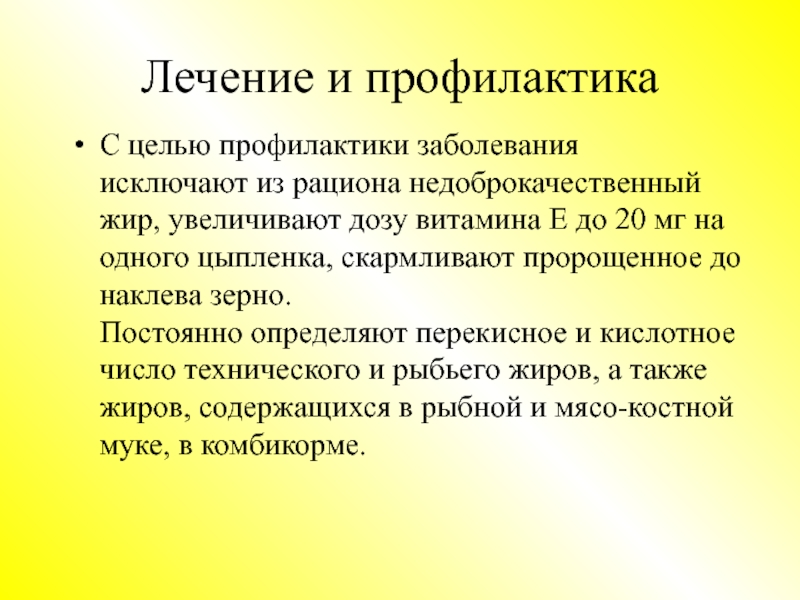 При появлении признаков заболевания взрослым курам назначают концентрат витамина Е в дозе 0,3 -0,5 мг на