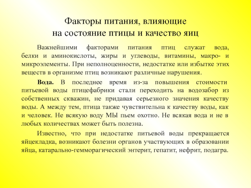 Известно, что при недостатке питьевой воды прекращается яйцекладка, возникают болезни органов участвующих в образовании яйца, катарально-гемморагический энтерит, гепатит, нефрит, подагра.