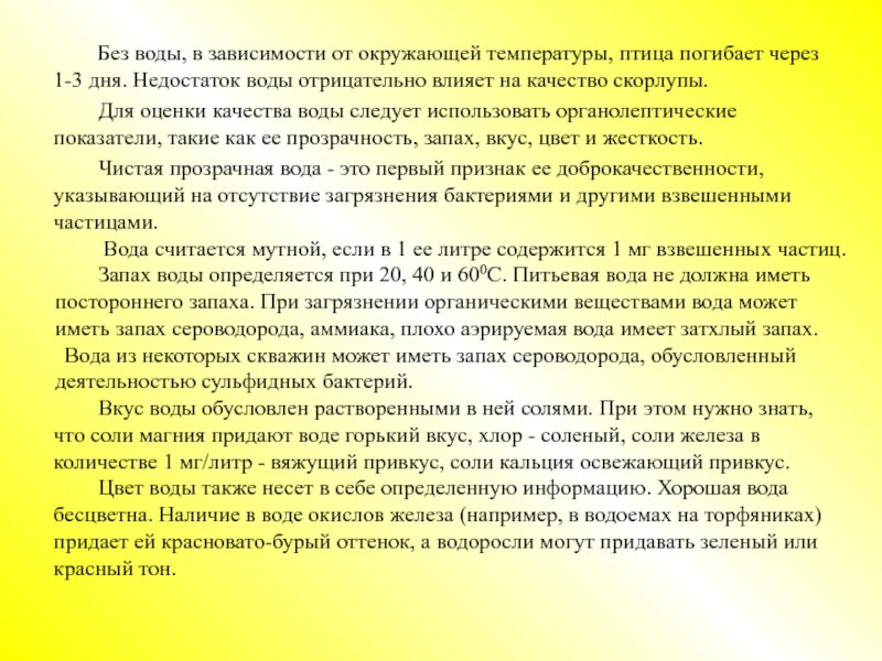 питьевой воды птицефабрики стали переходить на водозабор из собственных скважин, не придавая серьезного значения качеству воды. А между тем, птица также чувствительна к качеству воды, как и человек. Не всякую воду МЫ пьем охотно. Не всякая вода и не в любых количествах может быть полезна.