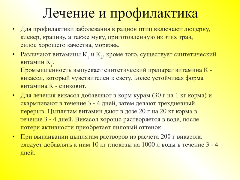 Для лечения викасол добавляют в корм курам (30 г на 1 кг корма) и скармливают в течение 3 - 4 дней, затем делают трехдневный перерыв. Цыплятам витамин дают в дозе 20 г на 20 кг корма в
