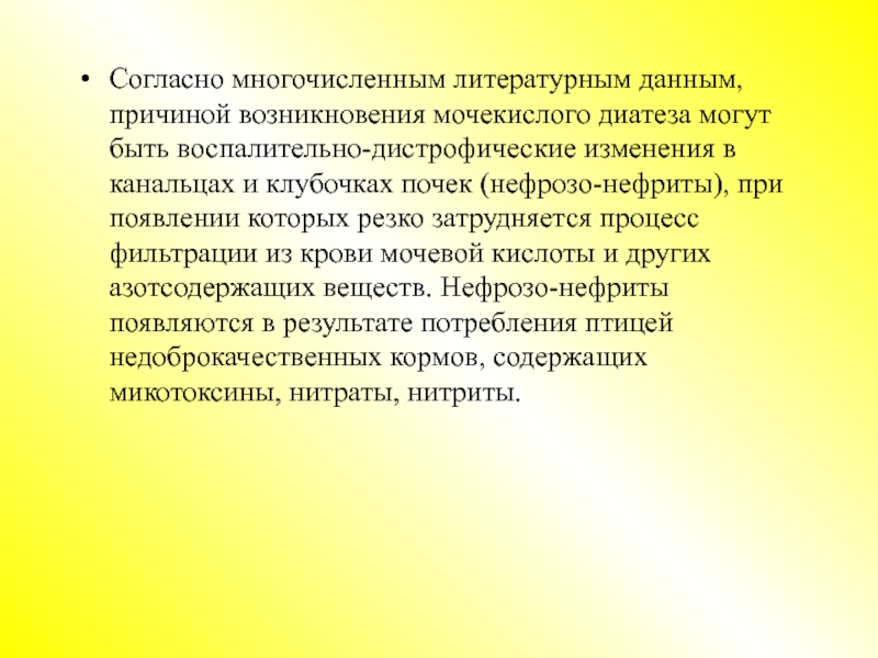 Слайд 14Согласно многочисленным литературным данным, причиной возникновения мочекислого диатеза могут быть