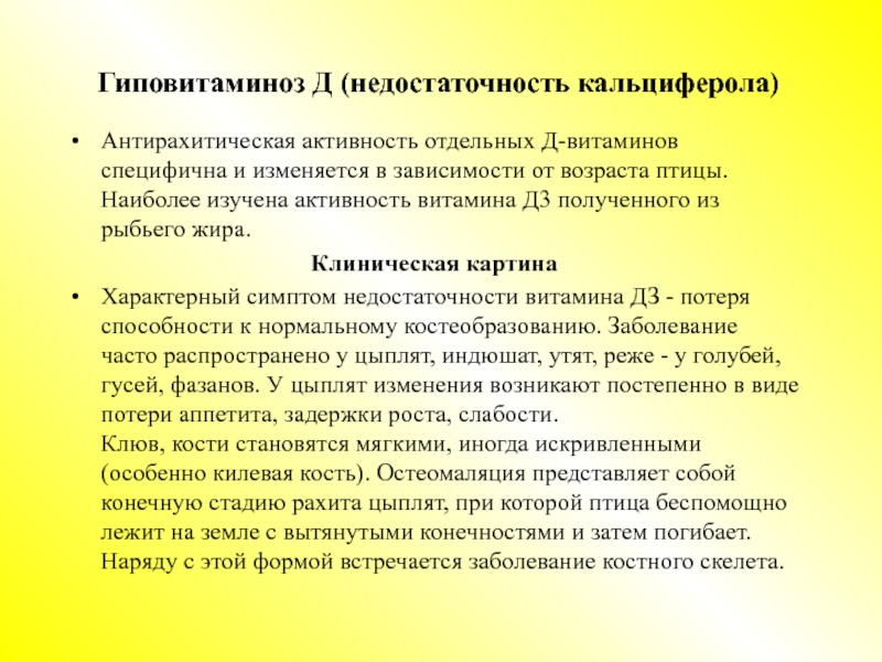 Характерный симптом недостаточности витамина ДЗ - потеря способности к нормальному костеобразованию. Заболевание часто распространено у цыплят, индюшат, утят, реже - у голубей,