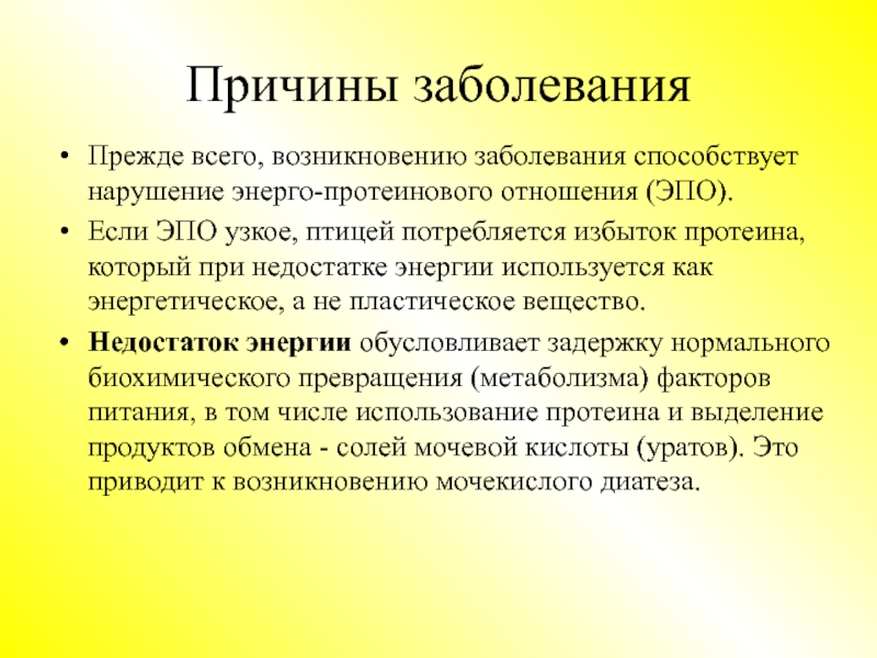 Прежде всего, возникновению заболевания способствует нарушение энерго-протеинового отношения (ЭПО).