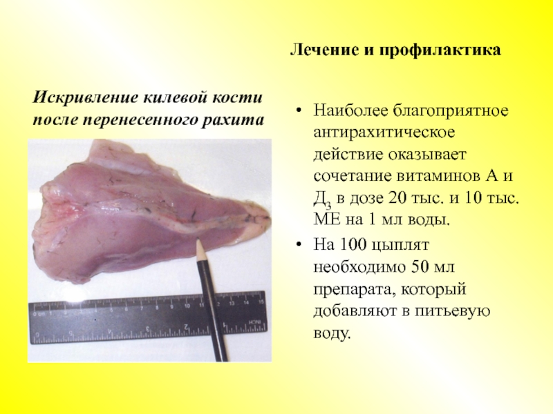 Клюв, кости становятся мягкими, иногда искривленными (особенно килевая кость). Остеомаляция представляет собой конечную стадию рахита цыплят, при которой птица беспомощно лежит на земле с вытянутыми конечностями и затем погибает. Наряду с этой формой встречается заболевание костного скелета.