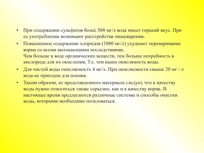 Слайд 6При содержании сульфатов более 500 мг/л вода имеет горький вкус.