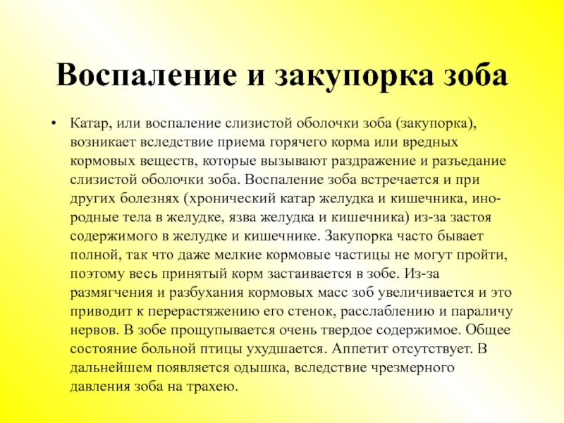 которые вызывают раздражение и разъедание слизистой оболочки зоба. Воспаление зоба встречается и при других болезнях (хронический катар желудка и кишечника, ино-