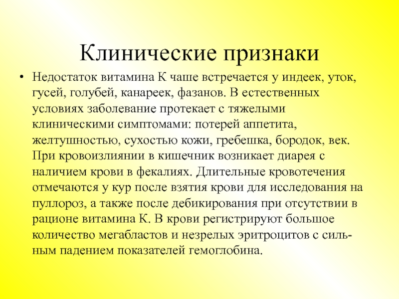 тяжелыми клиническими симптомами: потерей аппетита, желтушностью, сухостью кожи, гребешка, бородок, век. При кровоизлиянии в кишечник возникает диарея с наличием крови в фекалиях. Длительные кровотечения отмечаются у кур после взятия крови для исследования на пуллороз, а также после дебикирования при отсутствии в рационе витамина К. В крови регистрируют большое количество мегабластов и незрелых эритроцитов с силь-