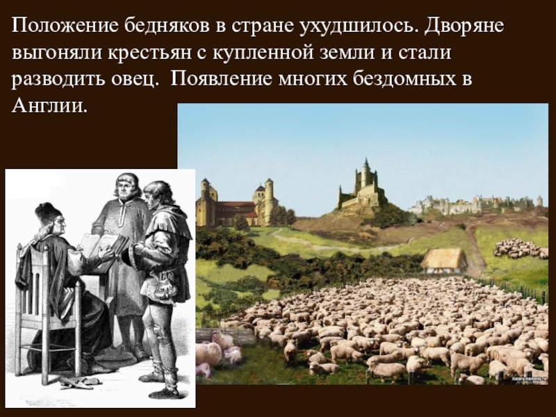 земли и стали разводить овец. Появление многих бездомных в Англии.