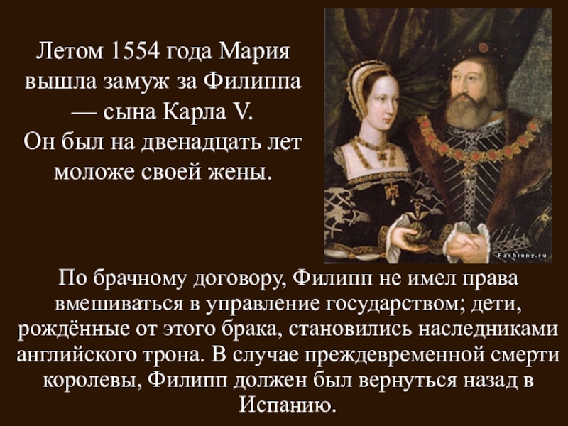 брачному договору, Филипп не имел права вмешиваться в управление государством; дети, рождённые от этого брака, становились наследниками английского трона. В случае преждевременной смерти королевы, Филипп должен был вернуться назад в Испанию.