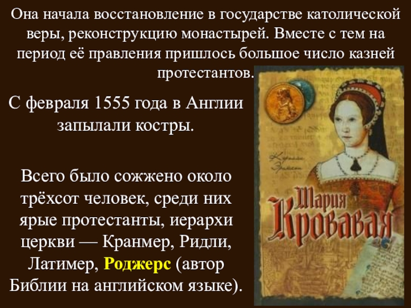 Слайд 22Она начала восстановление в государстве католической веры, реконструкцию монастырей. Вместе