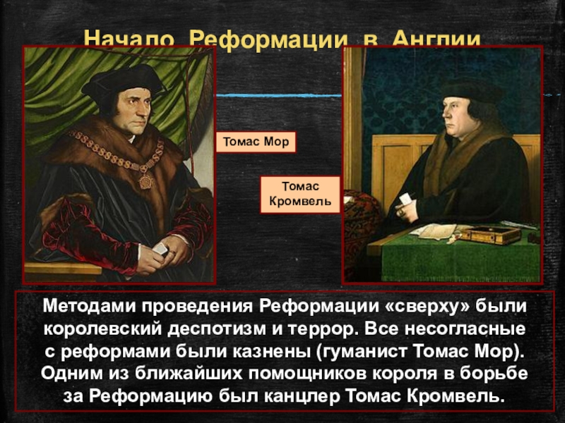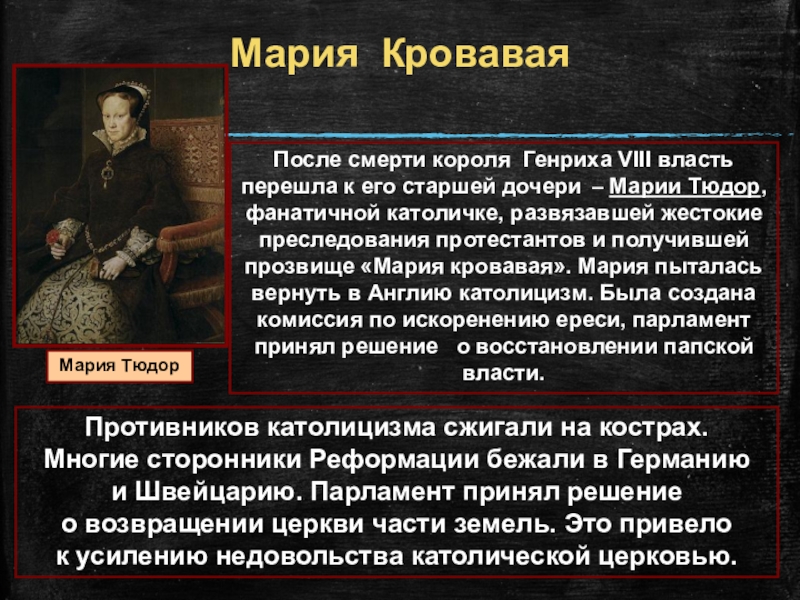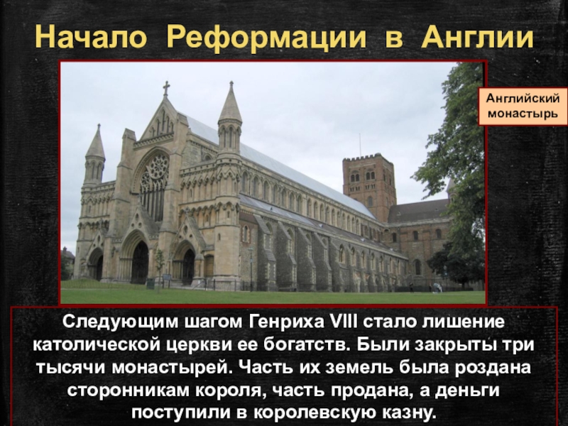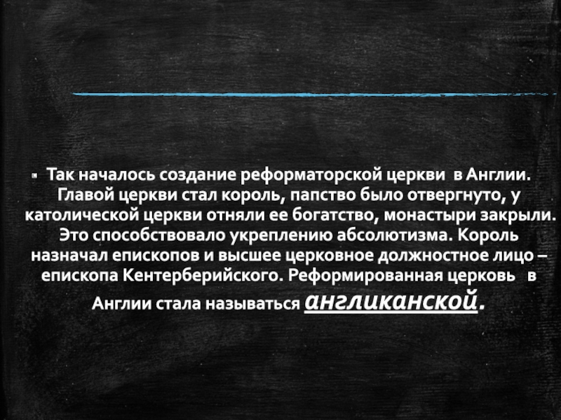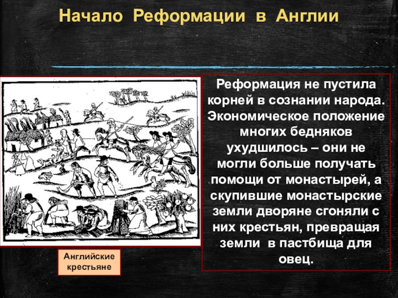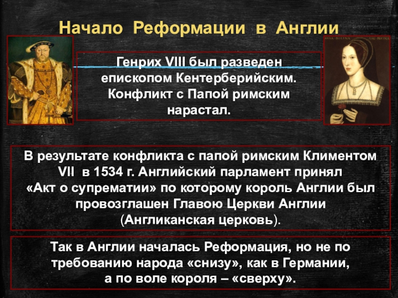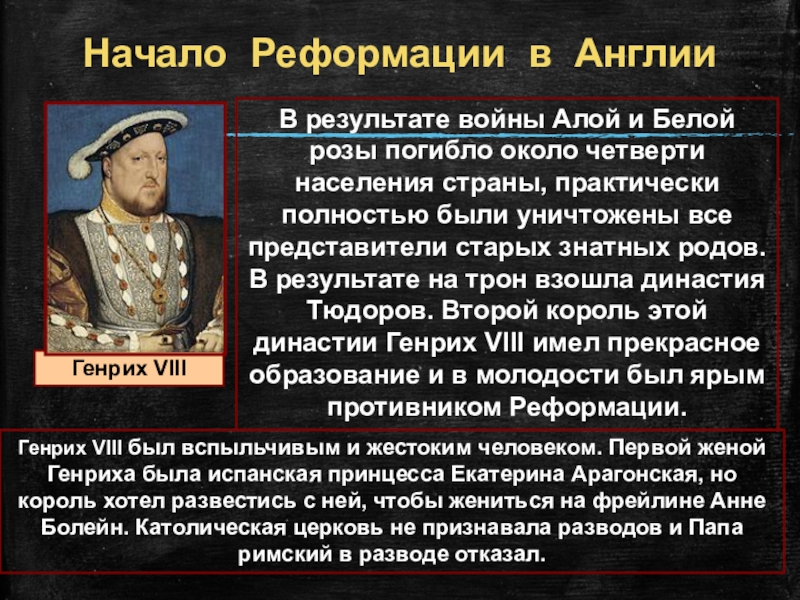 все представители старых знатных родов. В результате на трон взошла династия Тюдоров. Второй король этой династии Генрих VIII имел прекрасное образование и в молодости был ярым противником Реформации.Генрих VIII был вспыльчивым и жестоким человеком. Первой женой Генриха была испанская принцесса Екатерина Арагонская, но король хотел развестись с ней, чтобы жениться на фрейлине Анне Болейн. Католическая церковь не признавала разводов и Папа римский в разводе отказал.