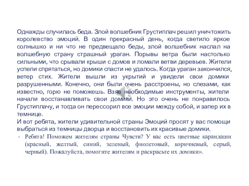 что не предвещало беды, злой волшебник наслал на волшебную страну страшный ураган. Порывы ветра были настолько сильными, что срывали крыши с домов и ломали ветви деревьев. Жители успели спря­таться, но домики спасти не удалось. Когда ураган закончился, ветер стих. Жители вышли из укрытий и увидели свои домики разрушенными. Конечно, они были очень расстроены, но слезами, как известно, горю не помо­жешь. Взяв необходимые инструменты, жители начали восстанавливать свои домики. Но это очень не понравилось Грустиплачу, и тогда он перессорил все эмоции между собой, и запер их в темнице.