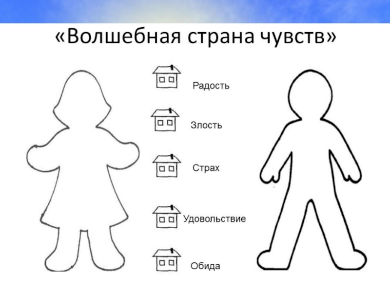 Ребята! Поможем жителям страны Чувств? У вас есть цветные карандаши (красный, желтый, синий, зеленый, фиолетовый, коричневый, серый, черный). Пожалуйста, помогите жителям и раскрасьте их домики».
