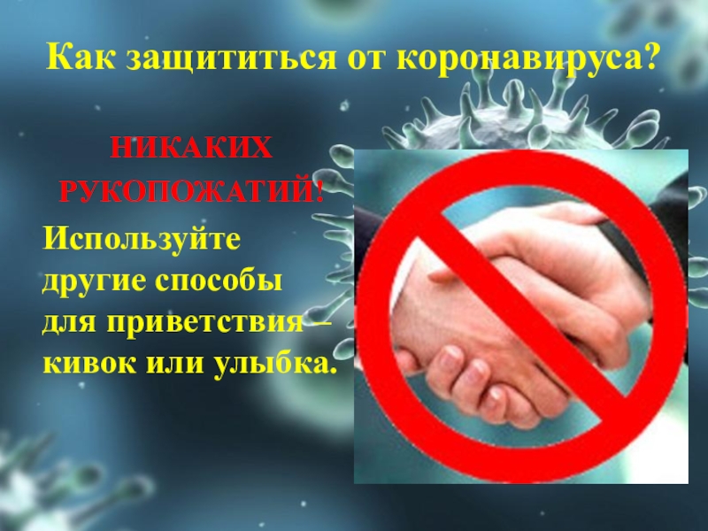 Как защититься от коронавируса?НИКАКИХРУКОПОЖАТИЙ!Используйте другие способы для приветствия – кивок или улыбка.