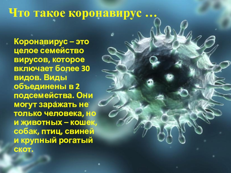 Что такое коронавирус … Коронавирус – это целое семейство вирусов, которое включает более 30 видов. Виды объединены в 2 подсемейства. Они могут заражать не только человека, но и животных – кошек,