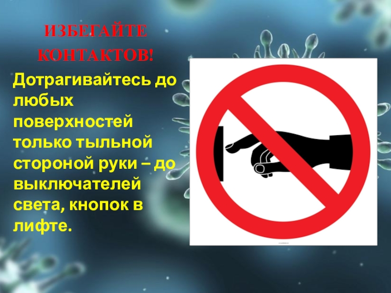 ИЗБЕГАЙТЕКОНТАКТОВ!Дотрагивайтесь до любых поверхностей только тыльной стороной руки – до выключателей света, кнопок в лифте.