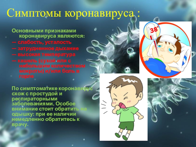 Слайд 4Симптомы коронавируса :