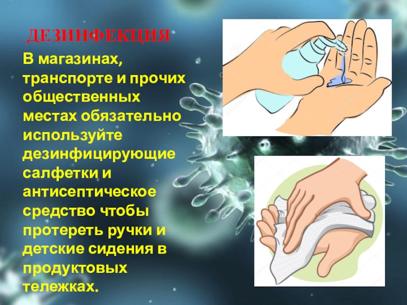 ДЕЗИНФЕКЦИЯВ магазинах, транспорте и прочих общественных местах обязательно используйте дезинфицирующие салфетки и антисептическое средство чтобы протереть ручки