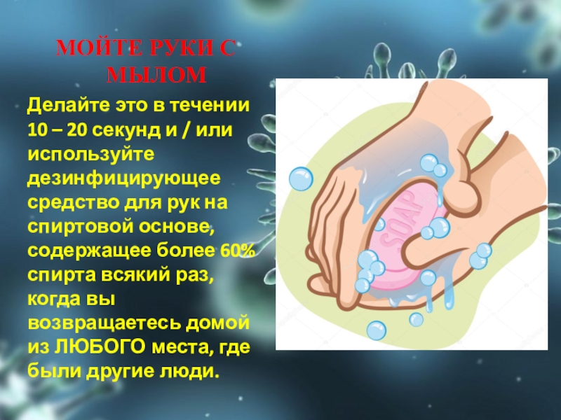 МОЙТЕ РУКИ С МЫЛОМДелайте это в течении 10 – 20 секунд и / или используйте дезинфицирующее средство для рук
