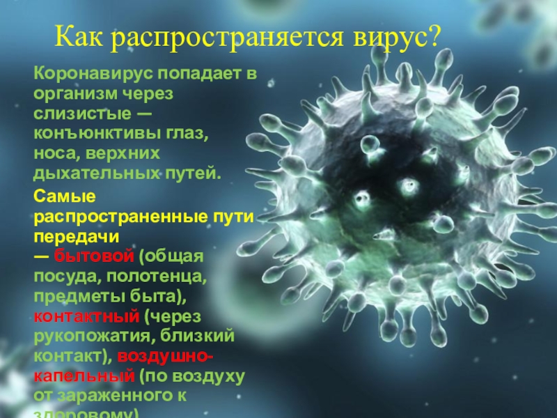 посуда, полотенца, предметы быта), контактный (через рукопожатия, близкий контакт), воздушно-капельный (по воздуху от зараженного к здоровому).