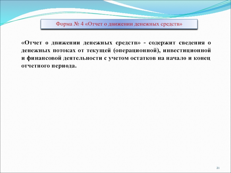 Слайд 21Форма № 4 «Отчет о движении денежных средств»