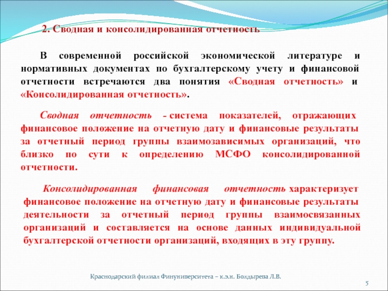 В современной российской экономической литературе и нормативных документах по бухгалтерскому учету и финансовой отчетности встречаются два понятия «Сводная отчетность» и «Консолидированная отчетность».