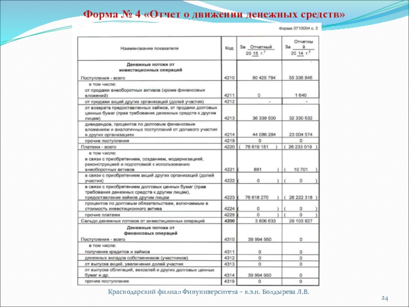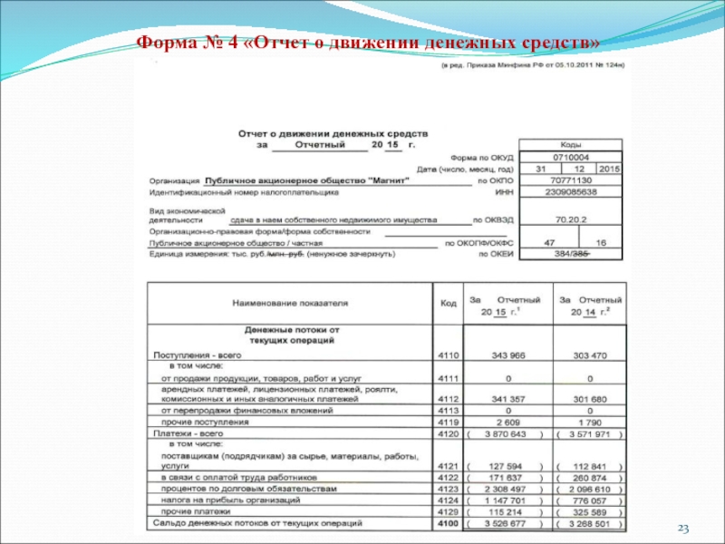Слайд 23Форма № 4 «Отчет о движении денежных средств»