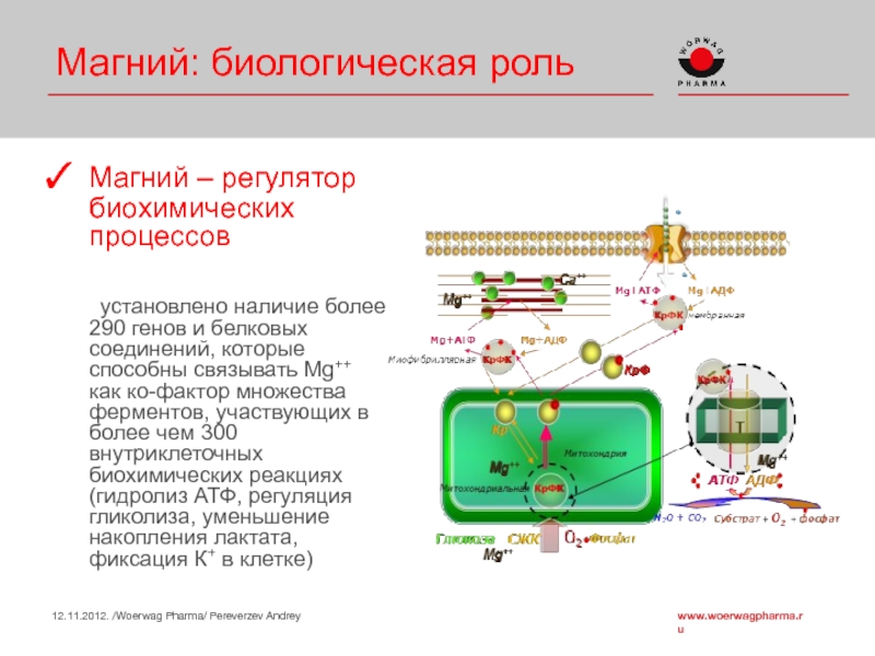 ко-фактор множества ферментов, участвующих в более чем 300 внутриклеточных биохимических реакциях (гидролиз АТФ, регуляция гликолиза, уменьшение накопления лактата, фиксация К+ в клетке)