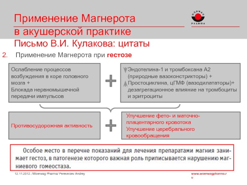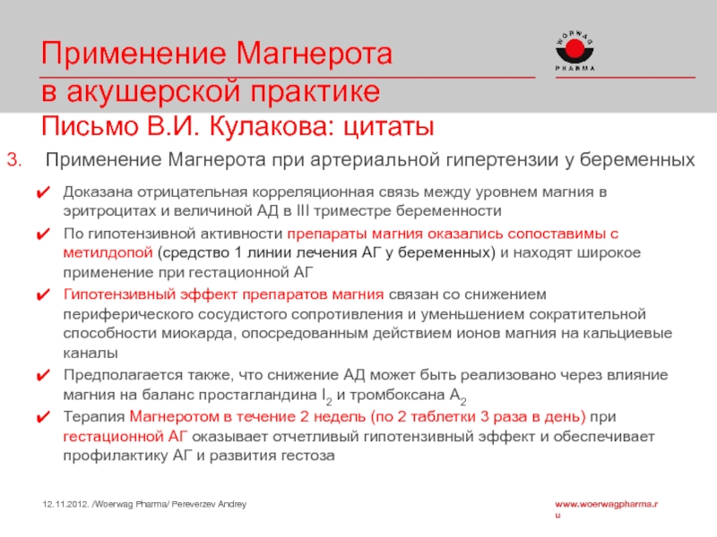 Терапия Магнеротом в течение 2 недель (по 2 таблетки 3 раза в день) при гестационной АГ оказывает отчетливый гипотензивный эффект и обеспечивает профилактику АГ и развития гестоза