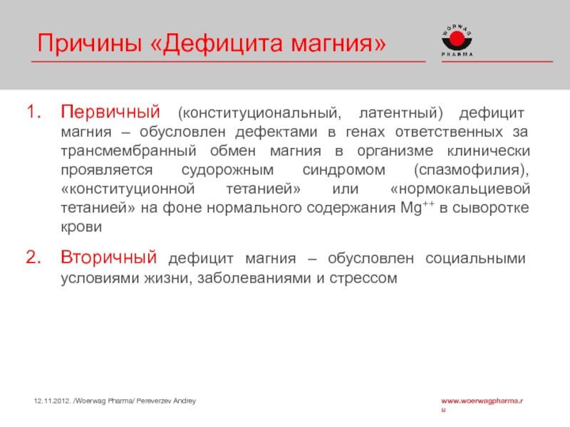 Первичный (конституциональный, латентный) дефицит магния – обусловлен
