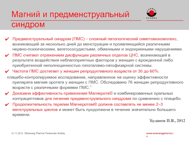Доказана эффективность применения Магнерота® и комбинированных оральных контрацептивов для лечения предменструального синдрома по сравнению с плацебо.
