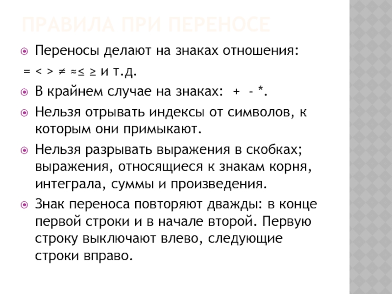 Нельзя разрывать выражения в скобках; выражения, относящиеся к знакам корня, интеграла, суммы и произведения.