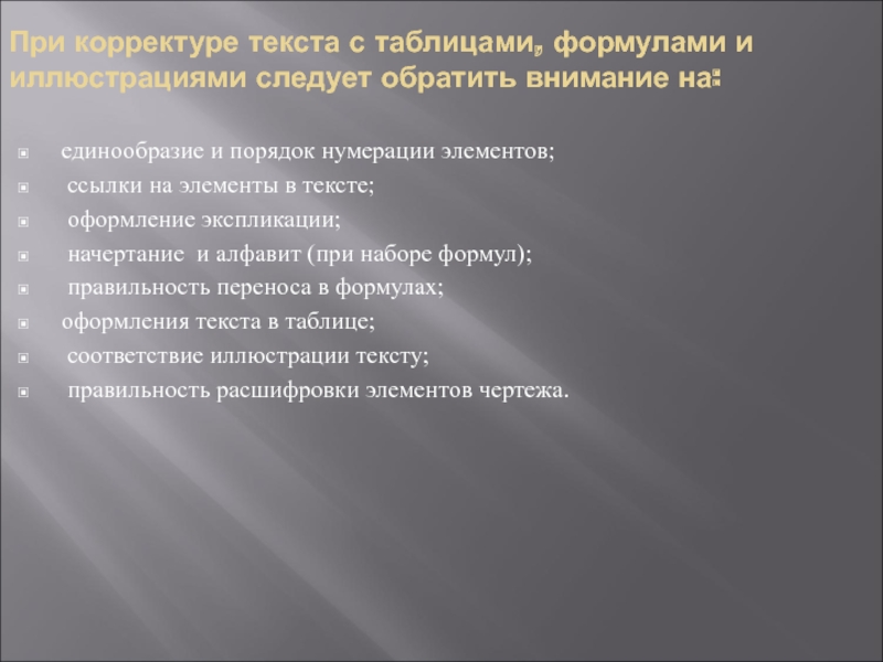 Слайд 17При корректуре текста с таблицами, формулами и иллюстрациями следует обратить