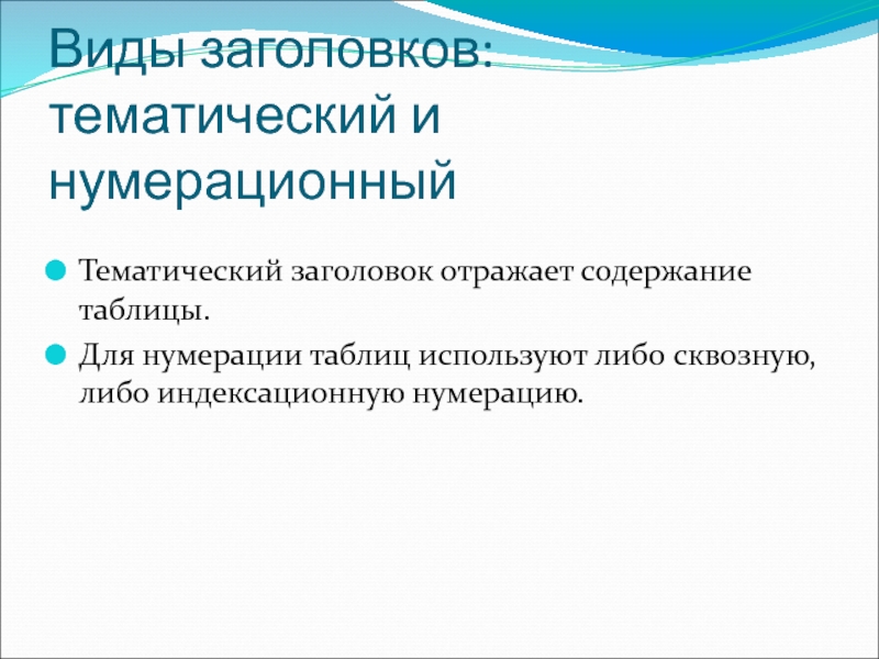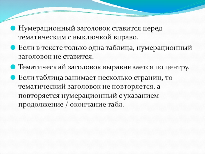 Слайд 7Нумерационный заголовок ставится перед тематическим с выключкой вправо.