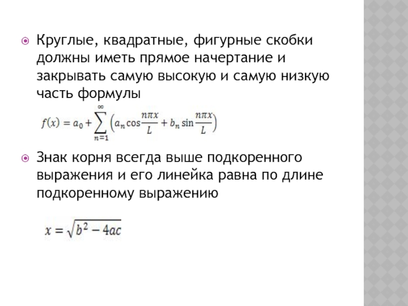 Слайд 10Круглые, квадратные, фигурные скобки должны иметь прямое начертание и закрывать