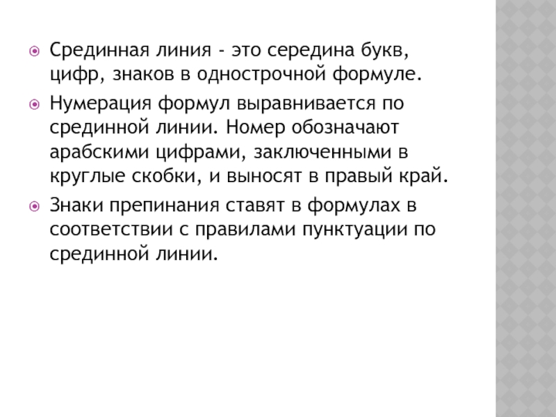Нумерация формул выравнивается по срединной линии. Номер обозначают арабскими цифрами,