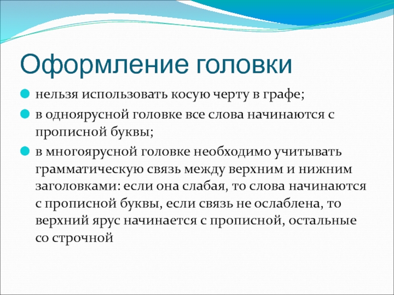 связь между верхним и нижним заголовками: если она слабая, то слова начинаются с прописной буквы, если связь не ослаблена, то верхний ярус начинается с прописной, остальные со строчной