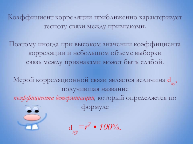 Слайд 19Коэффициент детерминации указывает на долю взаимной связи между признаками.