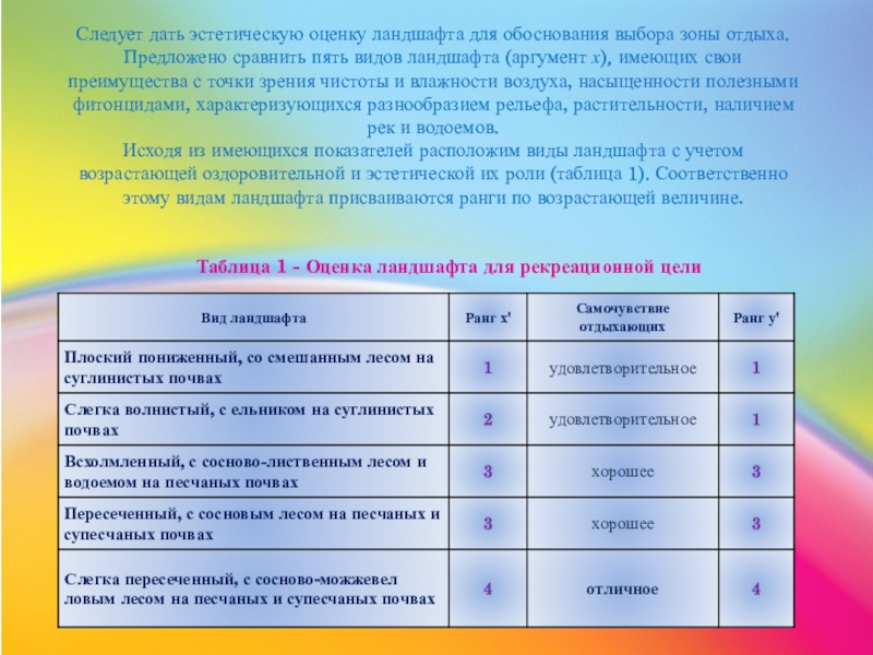 Исходя из имеющихся показателей расположим виды ландшафта с учетом возрастающей оздоровительной и эстетической их роли (таблица 1). Соответственно этому видам ландшафта присваиваются ранги по возрастающей величине.