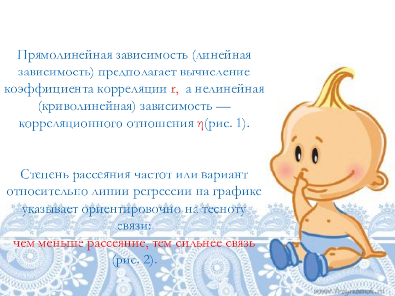 Слайд 12Прямолинейная зависимость (линейная зависимость) предполагает вычисление коэффициента корреляции r, а