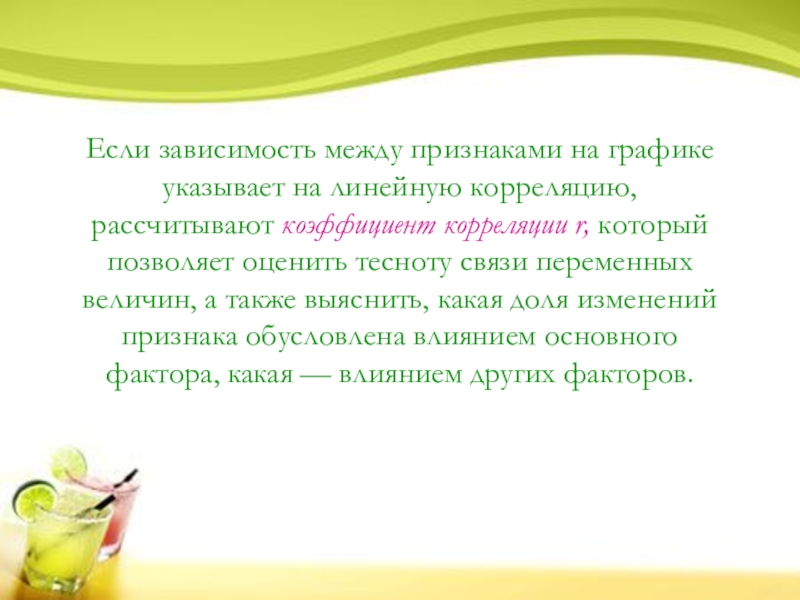 Слайд 16Если зависимость между признаками на графике указывает на линейную корреляцию,