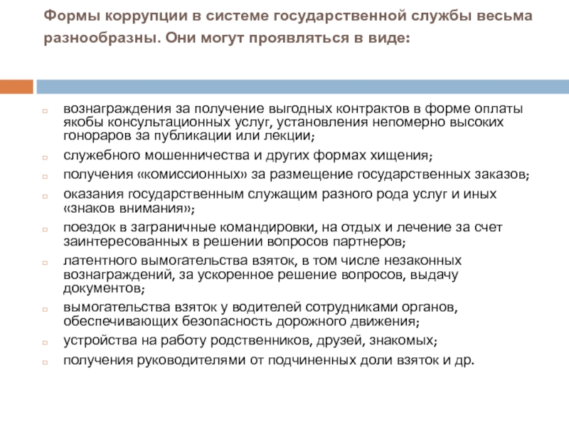 Формы коррупции в системе государственной службы весьма разнообразны. Они могут проявляться в виде: вознаграждения за получение выгодных