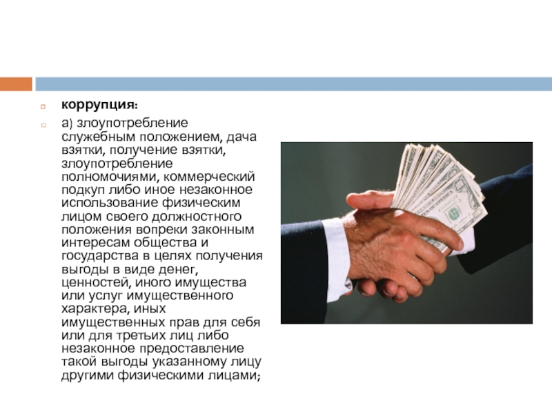 коррупция:а) злоупотребление служебным положением, дача взятки, получение взятки, злоупотребление полномочиями, коммерческий подкуп либо иное незаконное использование физическим лицом своего должностного положения вопреки законным интересам общества и государства в целях получения выгоды