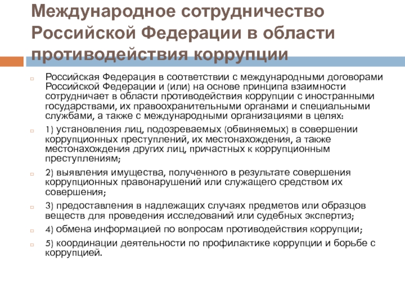 Международное сотрудничество Российской Федерации в области противодействия коррупцииРоссийская Федерация в соответствии с международными договорами Российской Федерации и